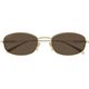 A colecao de oculos Pre-Fall 2025 combina silhuetas iconicas dos arquivos com um toque contemporâneo Estes oculos de sol com armacao oval sao confeccionados em metal dourado claro com o logotipo da Gucci vazado
