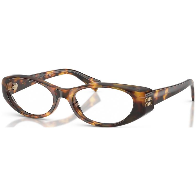 Especialista em criar looks ousados ??para o dia a dia, a Miu Miu apresenta este modelo oval com volume excepcional Uma nova tecnica sobrepoe duas lâminas de acetato para construir um detalhe diferenciado Para completar o visual, o iconico logo vertical da Miu Miu em metal acentua esse detalhe Definida por bordas externas curvadas para cima, esta armacao oval ganha um toque gatinho para um visual ainda mais marcante
