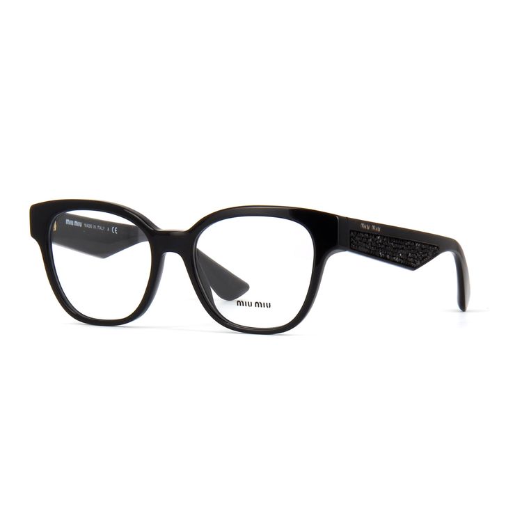 O modelo MU06OV tem armacao no formato ovalado e e produzido em acetato preto e conta sofisticados apliques de cristais negros nas hastes Comercializamos online somente a armacao, sem lentes de prescricao