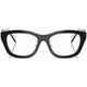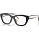 A forma minimalista da Prada encontra detalhes de design marcantes para criar este modelo de oculos de grau inovador para o dia a dia Com uma ponte nasal baixa, a armacao em formato de almofada se destaca com ângulos gatinho e hastes bicolores, que recebem um acabamento sofisticado gracas aos seus contornos geometricos e ao logotipo da Prada Milano