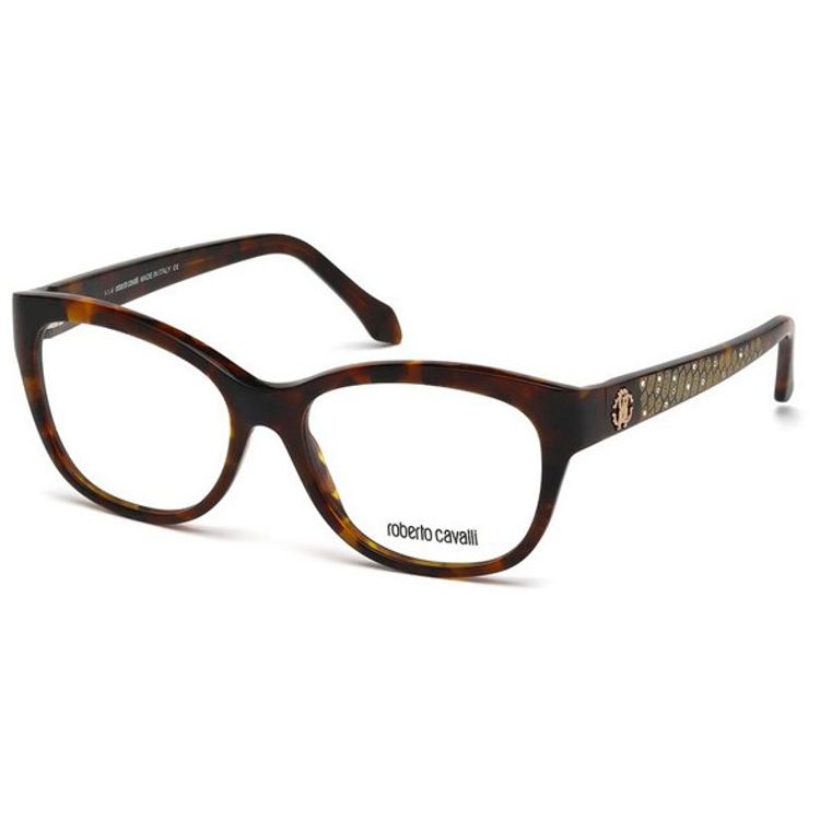 O modelo da Roberto Cavalli RC 846 Atria tem armacao no formato oval, produzida com fronte em acetato tartaruga e hastes decoradas >> Comercializamos online somente a armacao, sem lentes de prescricao